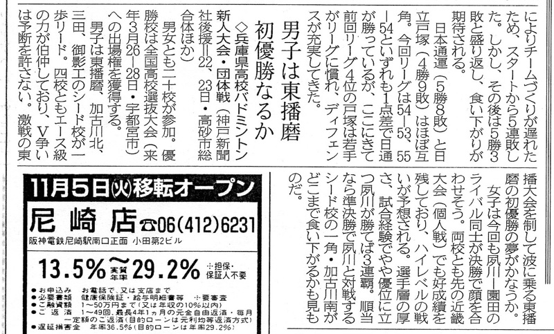 1991年兵庫県高校バドミントン新人大会団体戦展望・神戸新聞(平成3年11月22日)